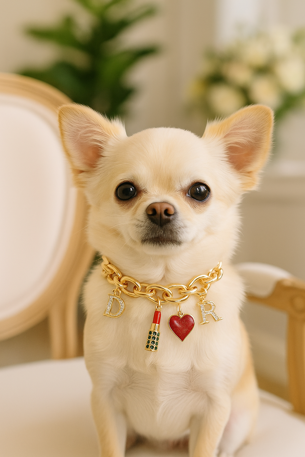 Diorable Lipstick Charm Dog Collar – Designer-Inspired Gold Chain with Enamel Charms