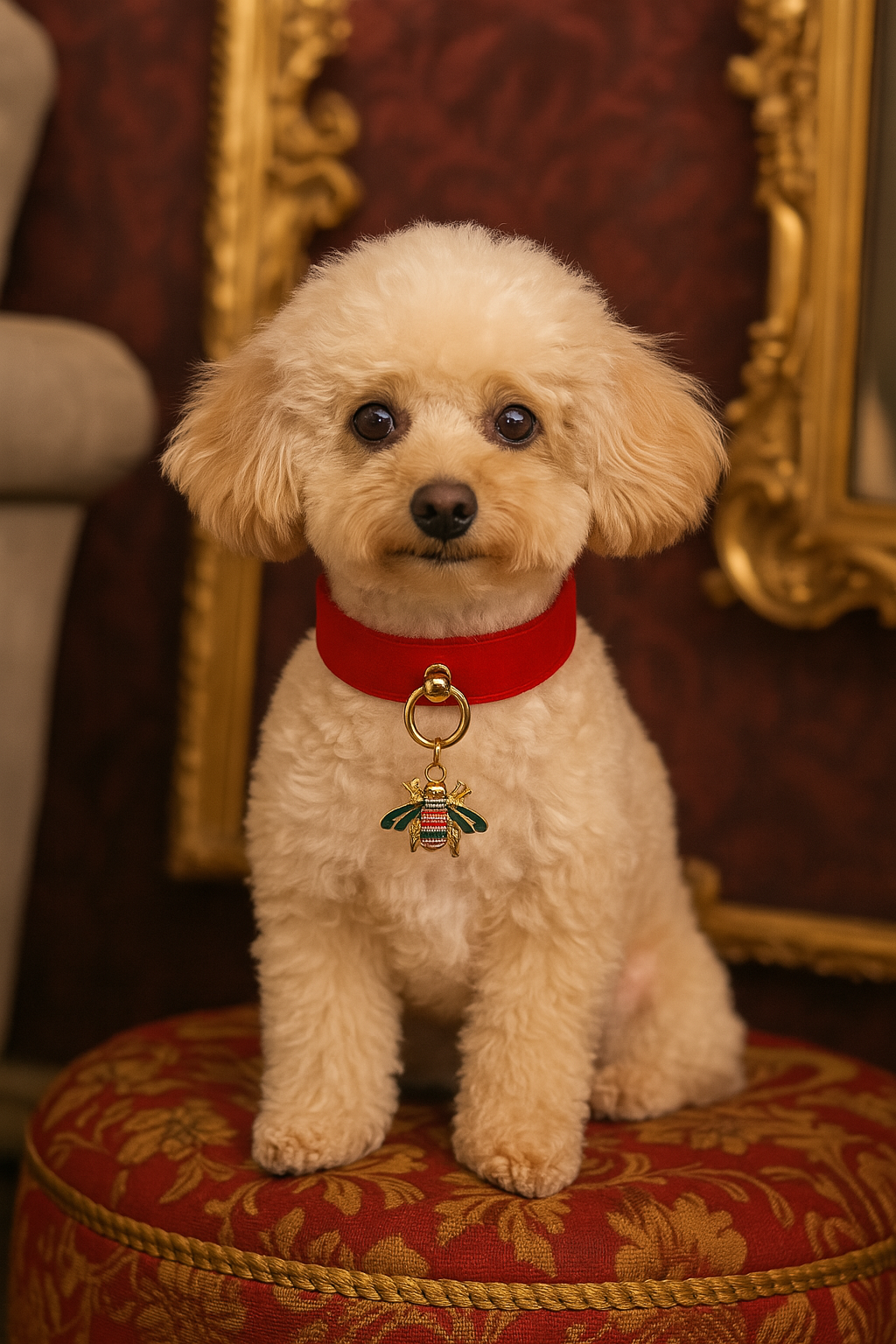 Crafted from decadent red velvet, the Red Velvet Bee Collar is a striking blend of comfort and couture. The collar’s plush, rich texture is complemented by a tapered silhouette: 3/4" wide at the front, narrowing to 1/2" near the buckle for a sleeker, more comfortable fit—especially around delicate necks.