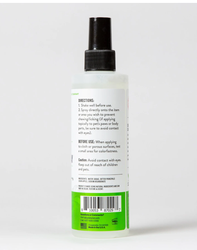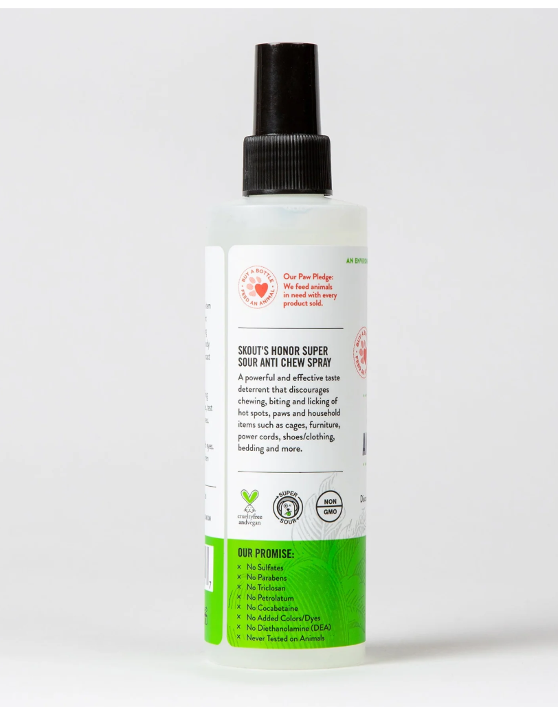 Skout’s Honor Super Sour! Anti-Chew Spray helps stop destructive chewing on shoes, boots, paws, cords, furniture, and more—made with a safe, natural bitter formula.