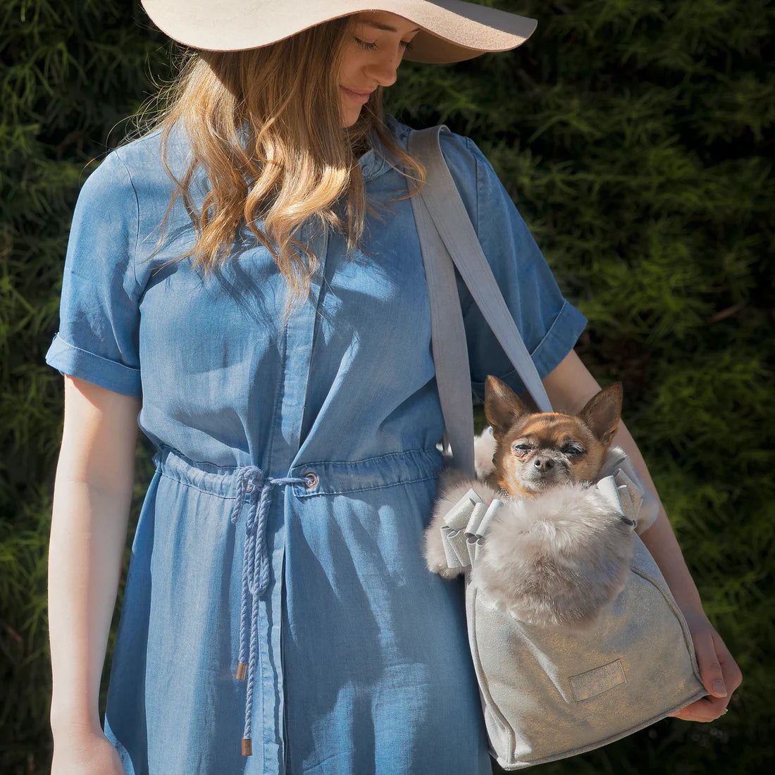 Turn your dog walks into runway moments with the Glitzerati Luxury Ultrasuede Dog Carrier. Crafted from imported Platinum Glitzerati Ultrasuede, this tote shines with embedded foil shimmer that never fades or washes off. Adorned with quadruple Nouveau bows set with real Giltmore crystals, it’s more than a carrier—it’s jewelry for your pup.